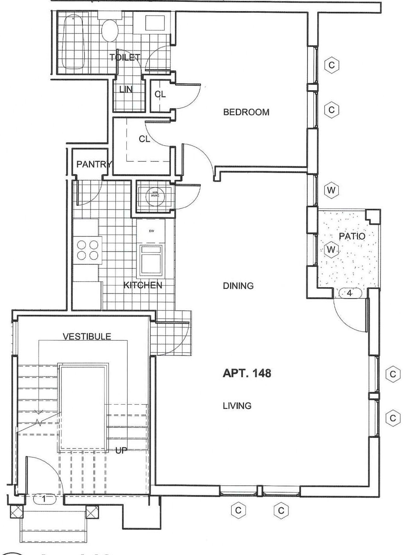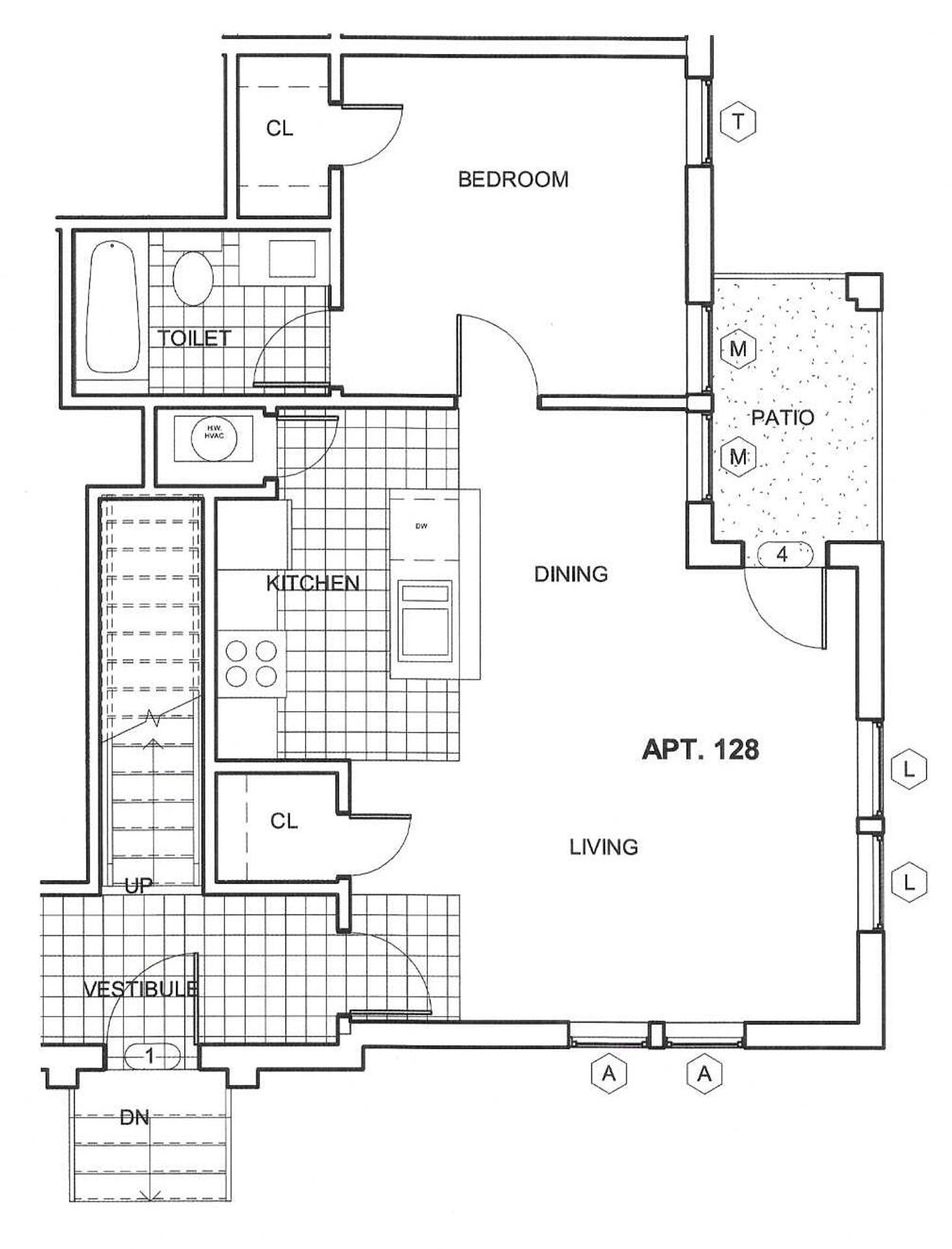 Our Degas floor-plan is our largest and most sought-after unit with patio. These spacious one bedrooms include a full kitchen and bath, dining area, and ample living and bedroom space. Our Degas units are 1st floor, fully renovated with granite counter-tops, faux wood flooring, updated fixtures and faucets, and more. These wonderful units are accessed by entering a secured vestibule with a key pad code.