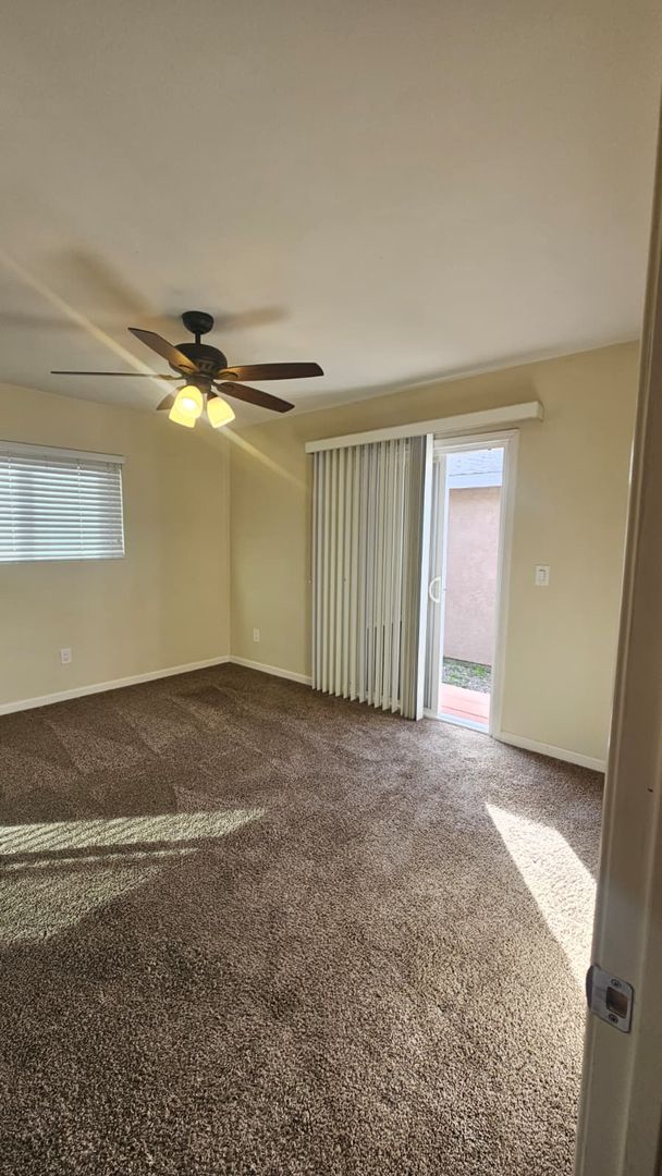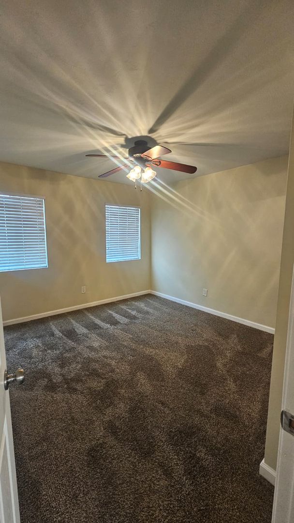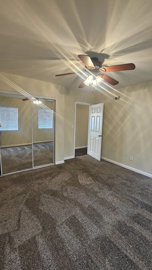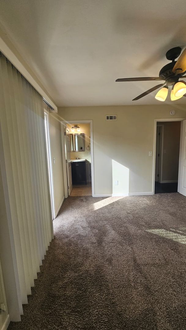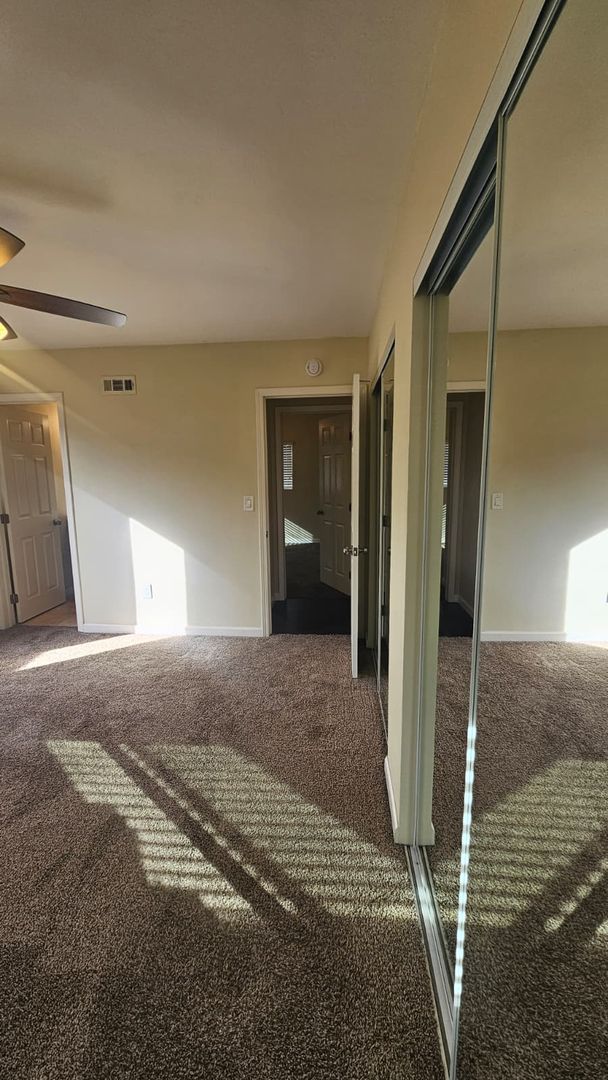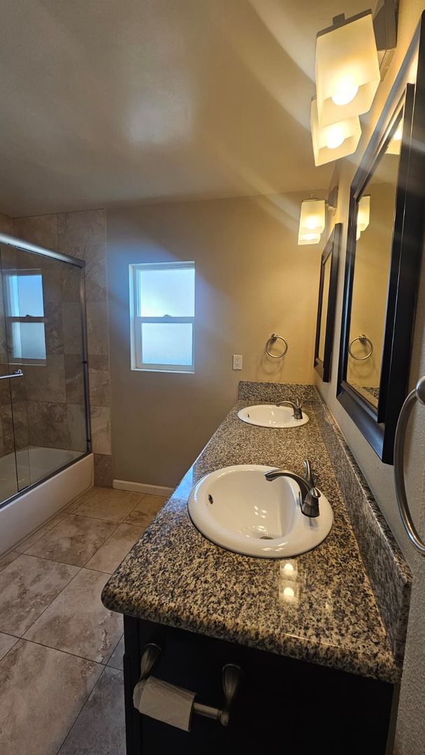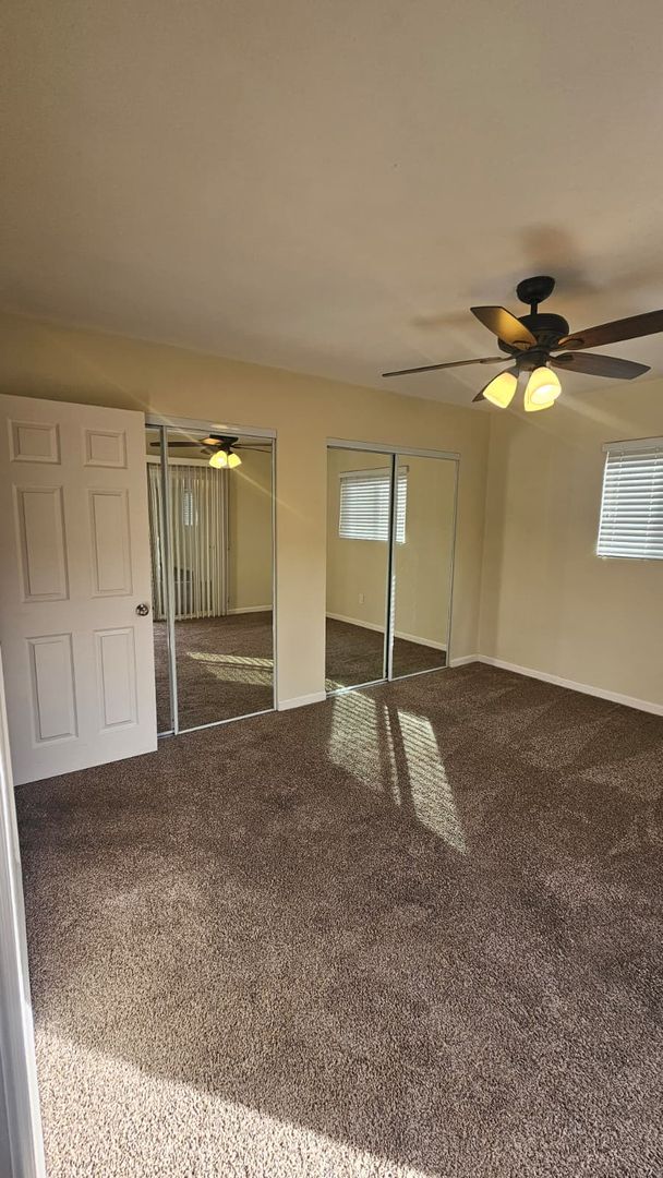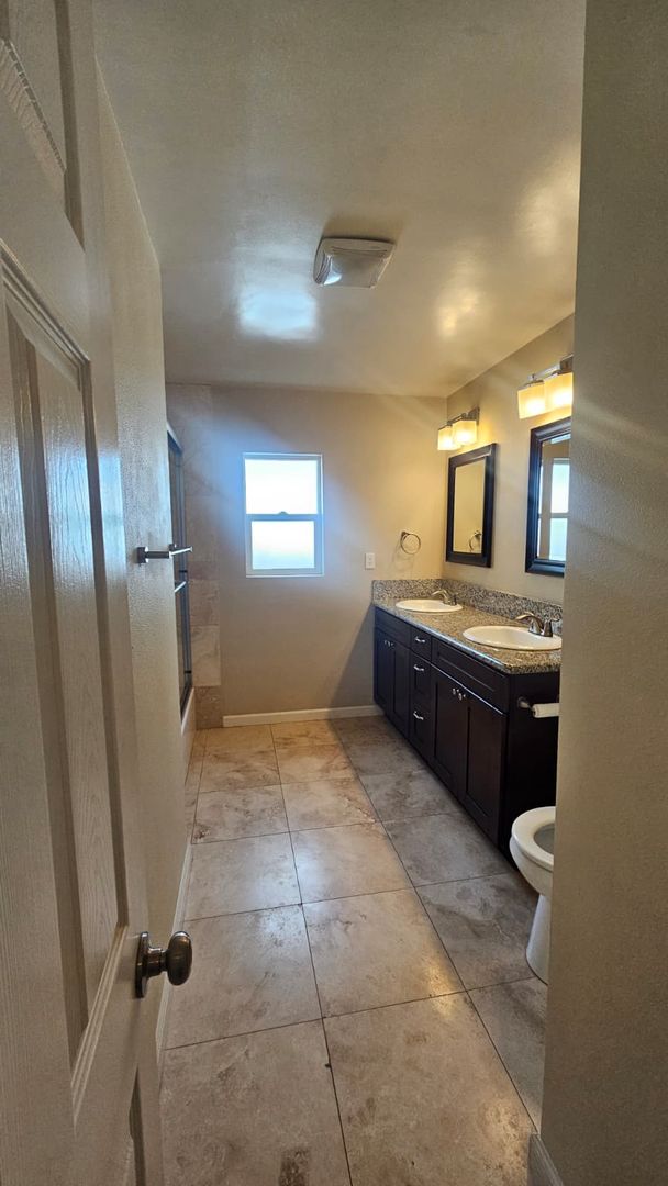 The home includes new dual-pane windows throughout, helping keep the space quiet and energy-efficient. All bedrooms offer mirrored closet doors and brand-new carpet, while the bathrooms showcase travertine floors, upgraded sinks, rich dark wood cabinetry, and brushed nickel fixtures and lighting for a clean, contemporary look.