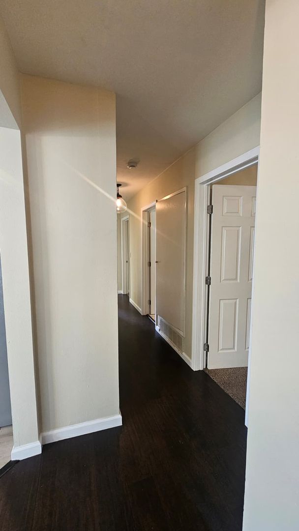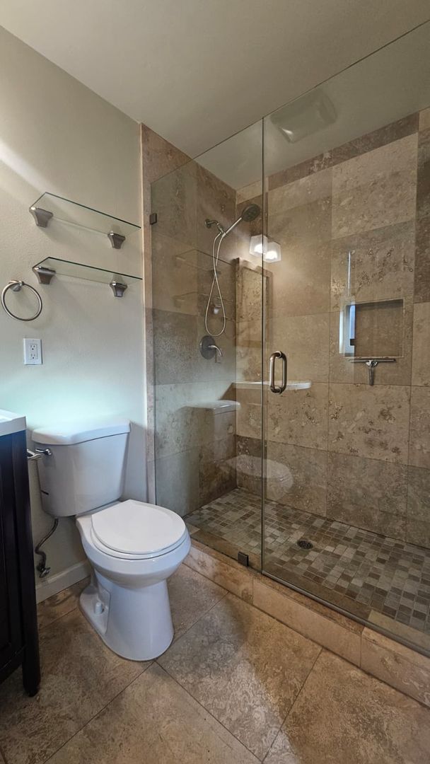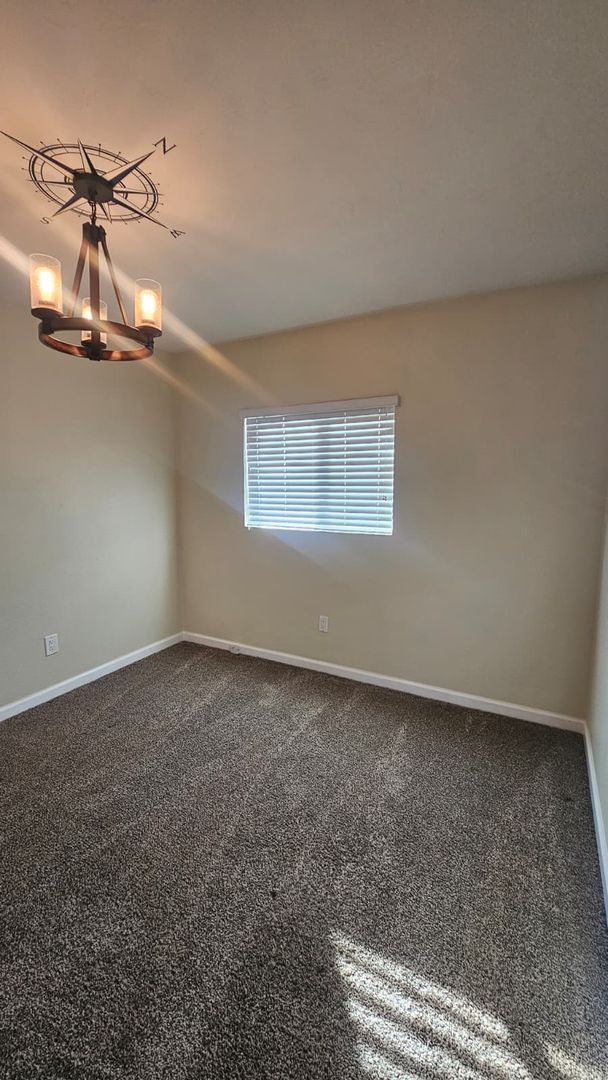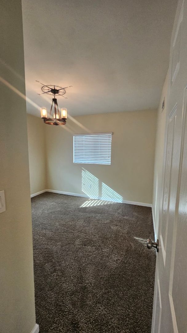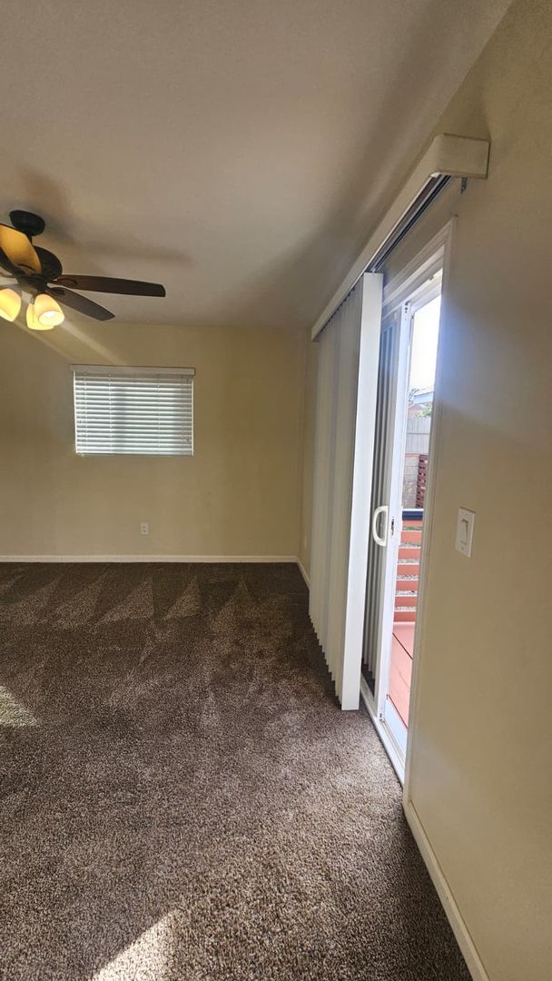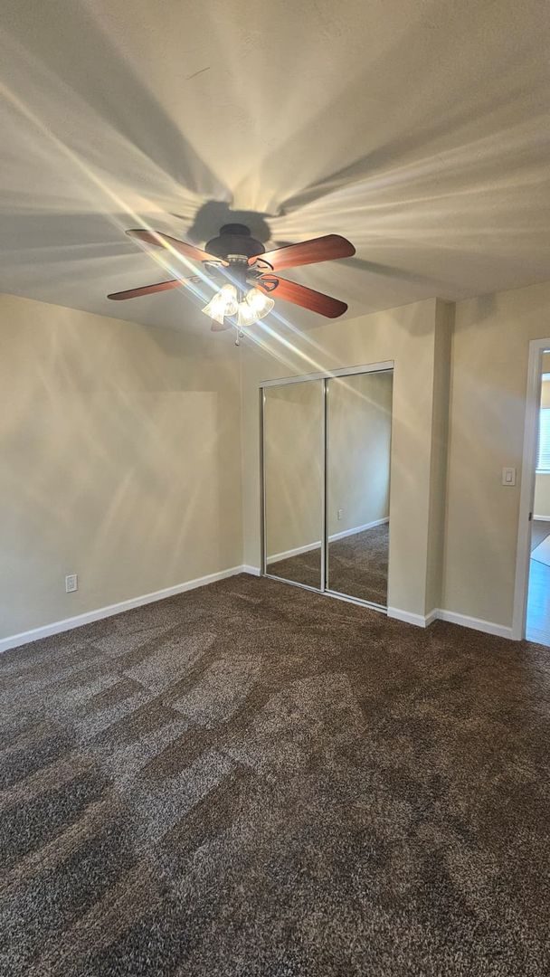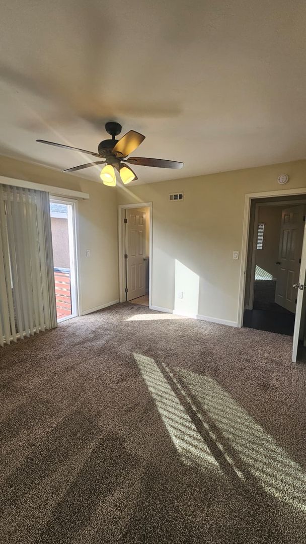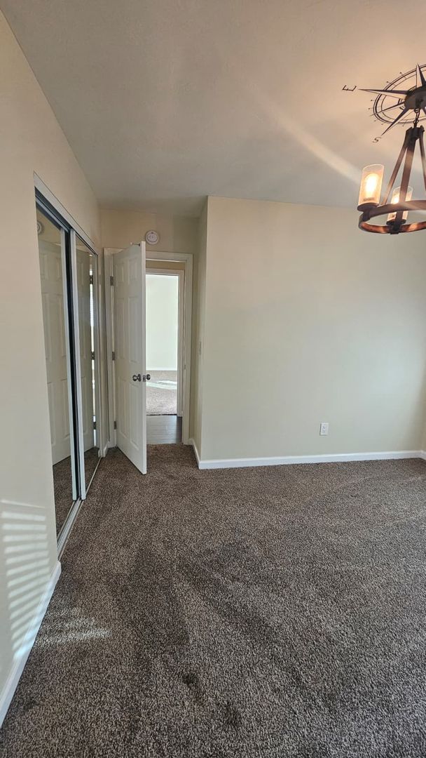 The home includes new dual-pane windows throughout, helping keep the space quiet and energy-efficient. All bedrooms offer mirrored closet doors and brand-new carpet, while the bathrooms showcase travertine floors, upgraded sinks, rich dark wood cabinetry, and brushed nickel fixtures and lighting for a clean, contemporary look.